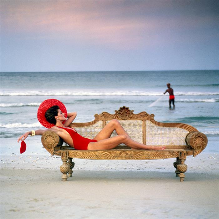 Pilar Crespi,daughter of Countessand Count of Crespi ,in a Krzia bathing suit ,on the coral sands of Trincomalee,Sri Lanka 1980 by Norman Parkinson ,all our iconic fine art prints are estate stamped and numbered verso in limited edition of 21 ,Tristans Gallery offer complementary shipping world wide